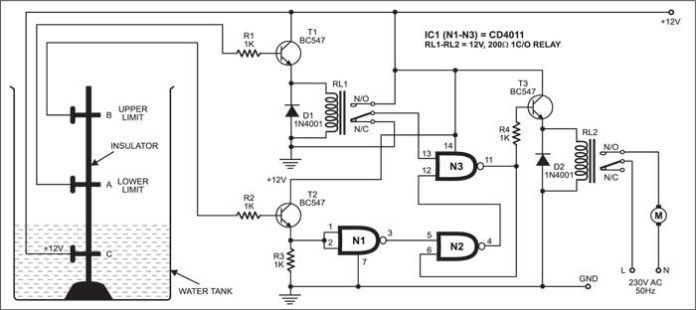 This simple, compact, and cost-effective design uses a Single NAND gate IC (CD4011) and operates on a 12V DC power supply, with minimal power consumption. The circuit can be divided into two main sections: - Advertisement - Automatic Water Pump Indicator Circuit Fig. 2: Automatic Water Pump Indicator Circuit